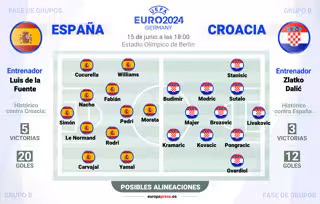 El seleccionador español, salvo sorpresa aunque en rueda de prensa jugó incluso al despiste, apostará por derribar la solidez balcánica con sus dos 'puñales', Nico Williams y un Lamine Yamal que tendrá su gran estreno con 16 años y posiblemente ante un defensor de primer nivel como Josko Gvardiol, que podría estar en el lateral izquierdo como ha hecho con asiduidad con el Manchester City.