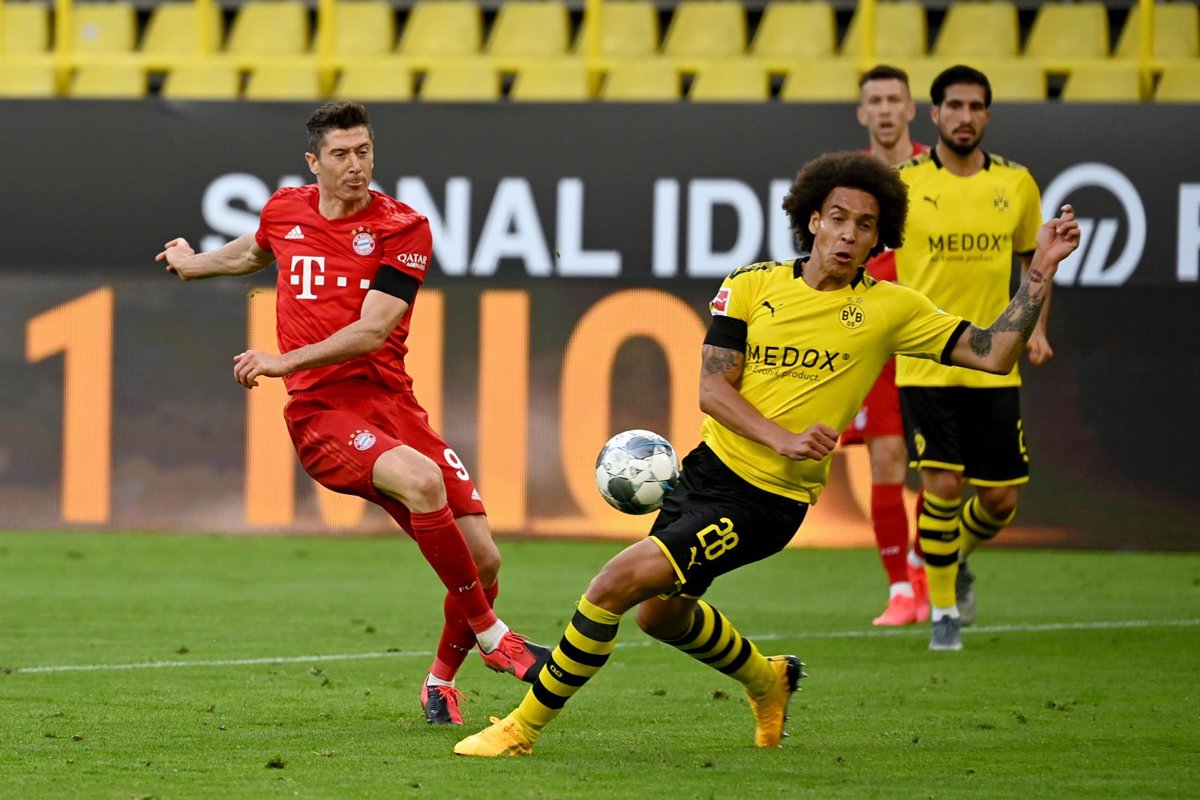Lewandowski dispara ante Witsel durante un Bayern-Borussia Dortmund de la Bundelisga 2019-2020 - Federico Gambarini/dpa-Pool/dpa - Archivo
