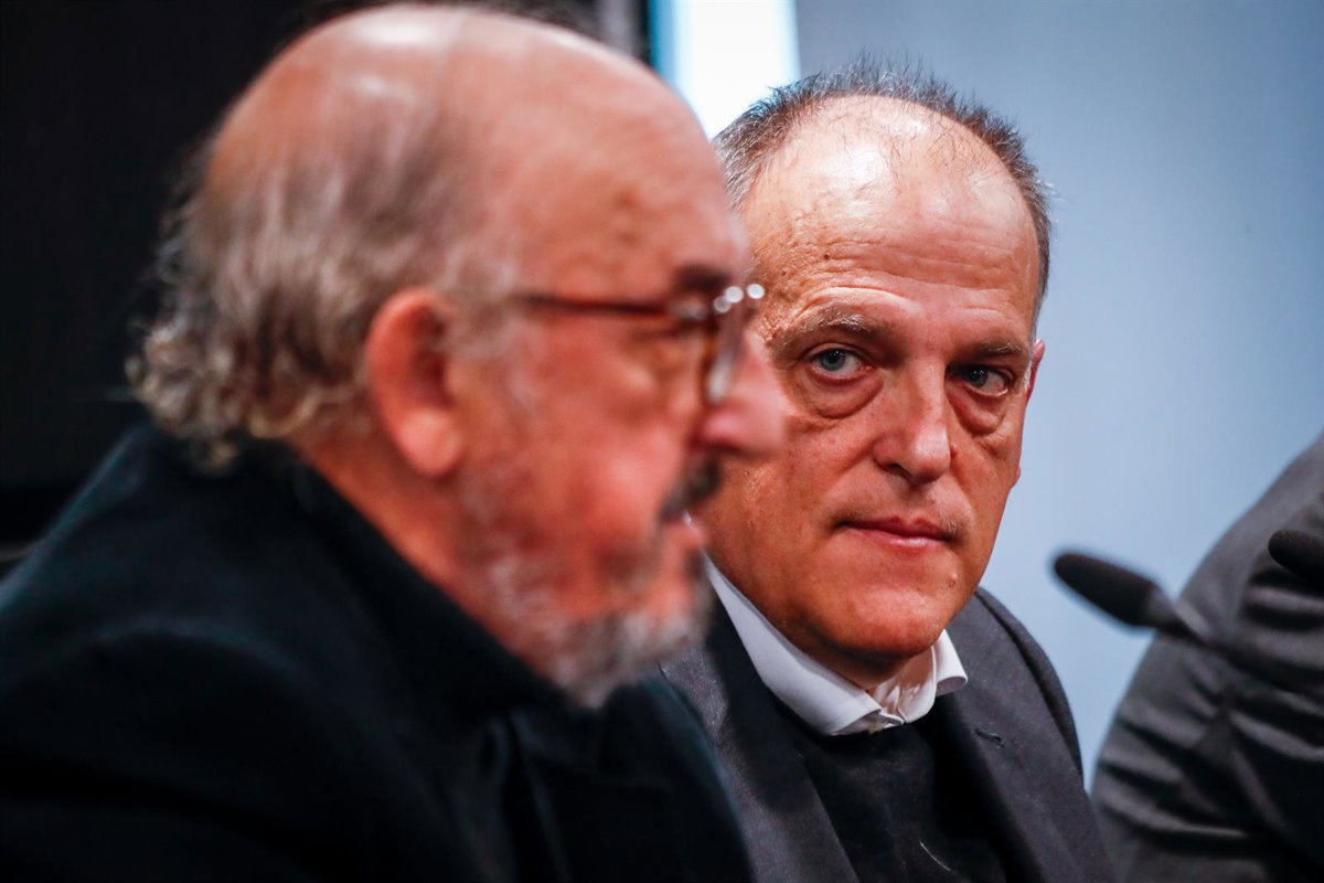 Javier Tebas, presidente de LaLiga, durante la presentación de un informe sobre el consumo de fútbol en los bares junto a Jaume Roures, presidente de Mediapro - Oscar J. Barroso / AFP7 / Europa Press - Archivo
