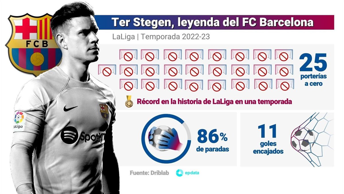 Ter Stegen se convirtió, tras no encajar ante Osasuna, en el portero europeo que más porterías a cero en una temporada en la historia de las cinco grandes ligas europeas con 25, superando la marca de Peter Cech (2004/05) y Jan Oblak (2015/16), ambos con 24.
