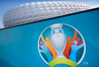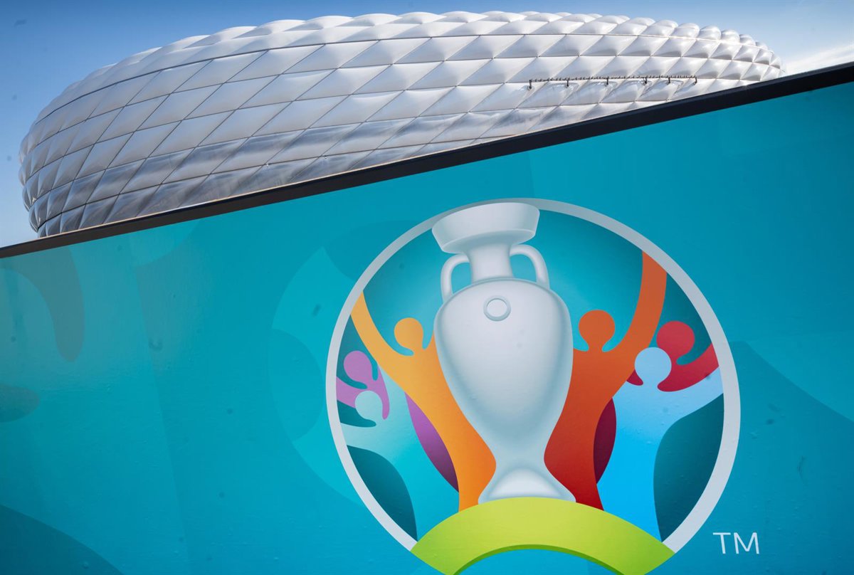 11 June 2021, Bavaria, Munich: A banner with the logo of the European Football Championship hangs in front of the Allianz Arena where the UEFA EURO 2020 group F soccer match between France and Germany, will take place on 15 June 2021. Photo: Peter Kneff - Peter Kneffel/dpa