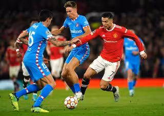 Archivo - Cristiano Ronaldo trata de marcharse de Marcos Llorente y Stefan Savic en el Manchester United-Atlético de Madrid de octavos de la Liga de Campeones 2021-2022 - Martin Rickett/PA Wire/dpa - Archivo