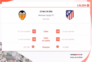 En el apartado ofensivo, el equipo colchonero tiene mejores números que los valencianos en goles por partido con 1,6 goles por encuentro del primero frente a 1 del segundo. En cuanto a la calidad de las ocasiones de gol generadas, el equipo de Simeone también supera a los de Corberán con 1,2 goles esperados frente a 0,8, según las estadísticas de Driblab consultadas por Europa Press.