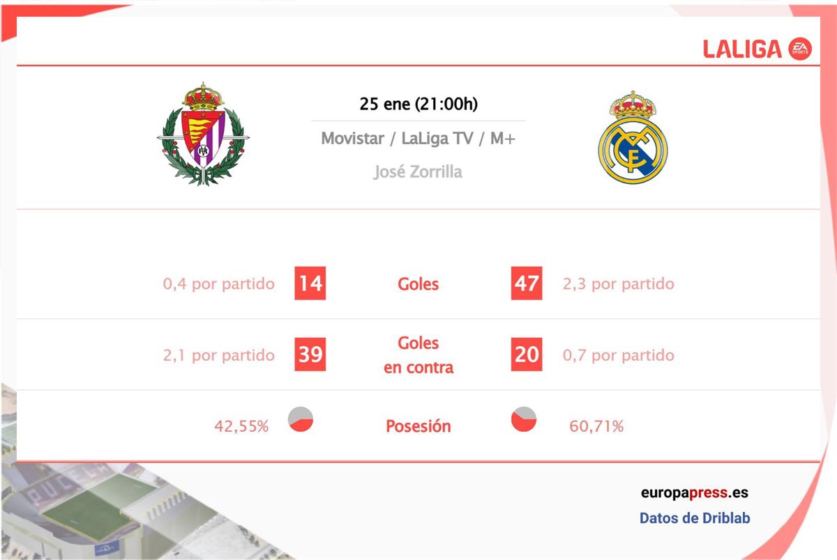 El Valladolid se enfrenta en la jornada 21 de LaLiga EA Sports en el estadio José Zorrilla ante el Real Madrid este sábado a las 21.00 (Movistar LaLiga), un partido al que llega tras haber perdido ante el Espanyol, no consiguiendo sumar ni un punto a los 15 que lleva en la competición. Por su parte, su rival esta jornada, el Real Madrid, llega líder y con 46 puntos tras sumar otros tres puntos tras vencer a Las Palmas en la pasada jornada.
