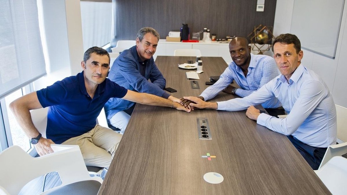 En la Ciutat Esportiva Joan Gamper, aprovechando un "paréntesis" en las vacaciones de Valverde según informó el club, el técnico se reunió junto al manager deportivo de fútbol, Pep Segura, el nuevo secretario técnico, Éric Abidal, y su adjunto, Ramon Planes.