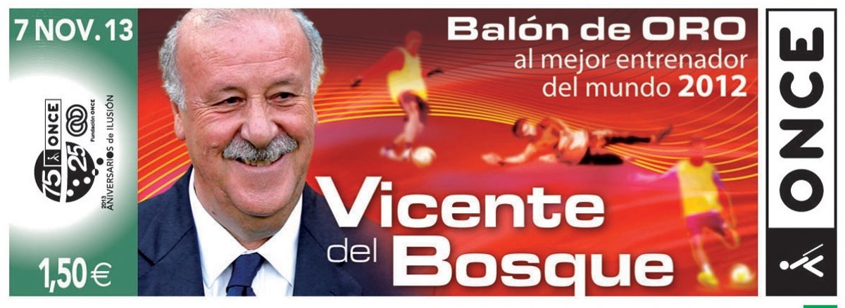 El seleccionador español de fútbol Vicente del Bosque, Balón de Oro al mejor entrenador del mundo en 2012, es el protagonista del cupón Diario de la ONCE que se sorteará este jueves, con su imagen presente en un total de 5,5 millones de cupones en manos de los 20.000 vendedores de la Organización.