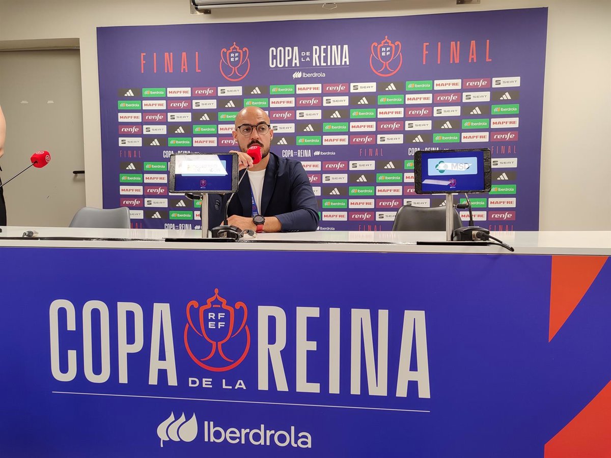 El entrenador del Atlético de Madrid Femenino, Víctor Martín, en rueda de prensa tras la final de la Copa de la Reina 2025 en Huesca - EUROPA PRESS