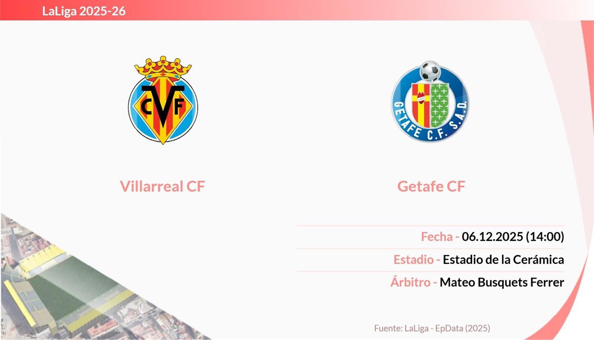 El partido que enfrenta a Villarreal y Getafe de la jornada 15 de LaLiga EA Sports 2025-26 se disputará el sábado 6 de diciembre a las 14.00 horas en el estadio de La Cerámica.