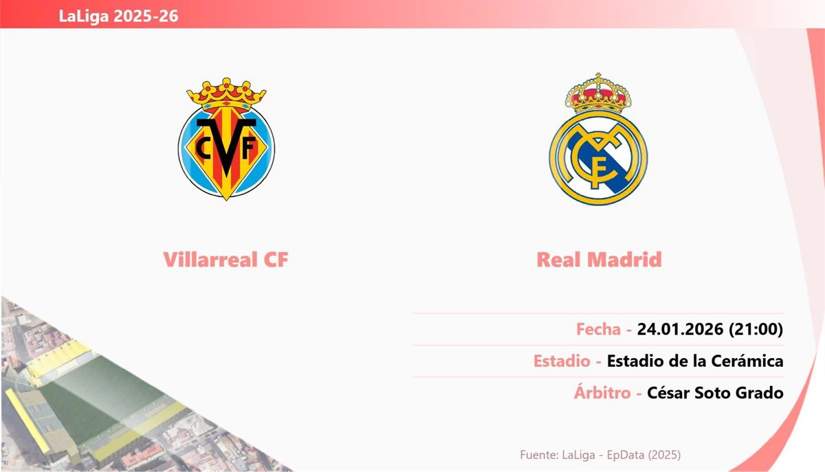 El partido que enfrenta a Villarreal y Real Madrid de la jornada 21 de LaLiga EA Sports 2025-26 se disputará el sábado 24 de enero a las 21.00 horas en el estadio de La Cerámica.
