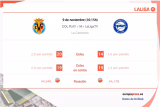 De media, el Villarreal ha recibido 1,7 goles y 12,8 remates por partido por los 1,6 goles y 10,1 remates que recibe el Alavés.