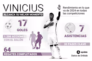 Pero si por algo está destacando el 2024 de Vinícius Júnior es por su capacidad de aparecer en los partidos. En los 23 que ha disputado, el brasileño ha participado en 1.206 acciones con balón, lo que supone una media de 52 por encuentro, con los que ha generado 30 ocasiones. Entre ellos, destacan el decisivo partido de vuelta de semifinales de Liga de Campeones ante el Bayern Múnich en el que 62 balones pasaron por sus botas.