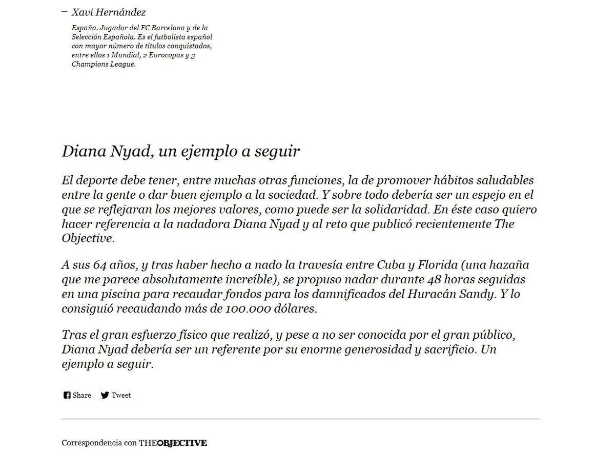 El jugador del FC Barcelona y de la selección española Xavi Hernández se ha estrenado este martes como articulista en el diario online 'The Objective' con un halago a la veterana nadadora estadounidense Diana Nyad, quien unió Cuba y Florida y ha recaudado 100.000 dólares para los damnificados del Huracán Sandy.