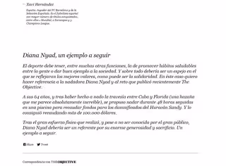 "El deporte debe tener, entre muchas otras funciones, la de promover hábitos saludables entre la gente o dar buen ejemplo a la sociedad. Y sobre todo debería ser un espejo en el que se reflejaran los mejores valores, como puede ser la solidaridad. En éste caso quiero hacer referencia a la nadadora Diana Nyad", asegura Xavi en su artículo.