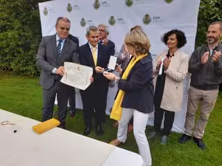 El presidente del Consejo Superior de Deportes (CSD), José Manuel Franco, entrega la Medalla de Oro al Mérito Deportivo a título póstumo a la familia de la exgolfista Celia Barquín. - CSD