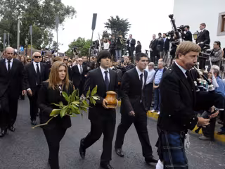 Los hermanos e hijos de Severiano Ballesteros han portado sus cenizas desde el domicilio familiar hasta la parroquia del pueblo, donde se celebra el funeral. Después, está previsto que las cenizas queden junto al magnolio de la finca del golfista.