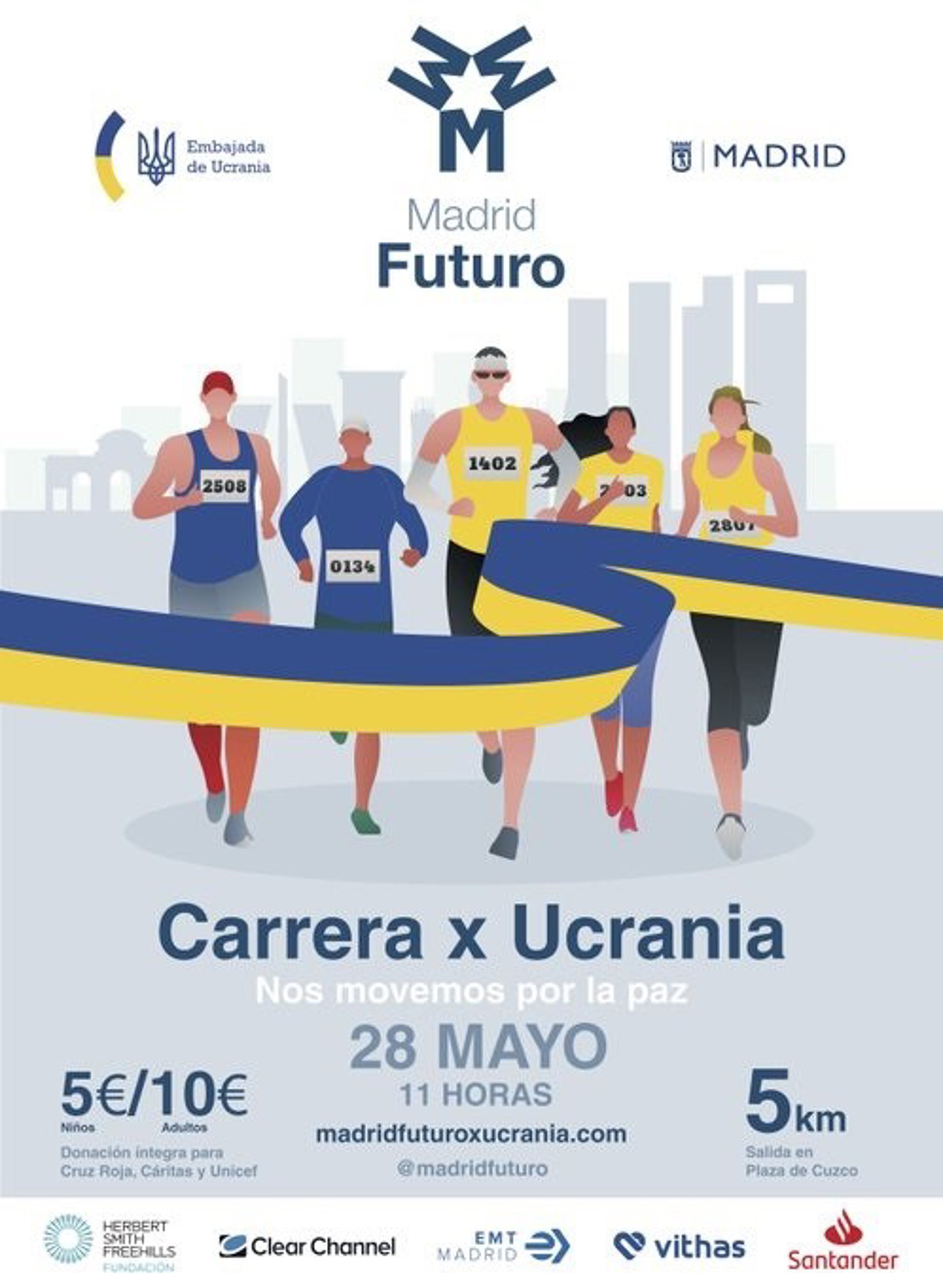 La iniciativa 'Madrid Futuro x Ucrania' convertirá el 28 de mayo las calles de la capital en una gran bandera de Ucrania en la marcha de 5 kilómetros organizada por Madrid Futuro en colaboración con Cáritas, Cruz Roja y Unicef, en la que los fondos recaudados irán destinados a la ayuda humanitaria en el país exsoviético y la acogida de refugiados.