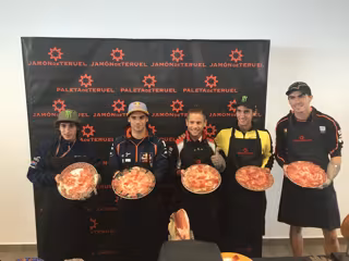 Los pilotos españoles de MotoGP Álvaro Bautista y Álex Rins, el francés Loris Baz, el portugués Miguel Oliveira y el italiano Niccolò Antonelli han cambiado este jueves su mono de entrenamiento por unos mandiles y han logrado extraer unas virutas de jamón de Teruel que han saboreado en el 'paddock' de Motorland en Alcañiz.