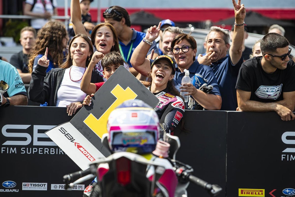 La piloto española de motociclismo Beatriz Neila tras ganar una prueba del Mundial femenino de motociclismo - WORLDWCR