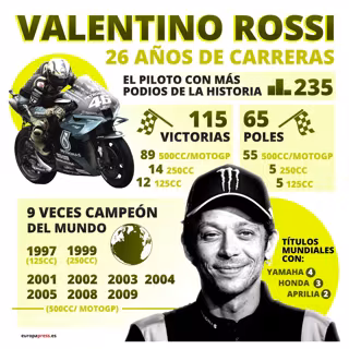 Pero el turno de guardia como 'Il Dottore' de urgencias de sus fans, y hasta detractores que pueda tener, terminó este domingo tras 26 Mundiales a sus espaldas. Y lo hizo con nueve títulos mundiales en su poder --uno en 125cc (1997), uno en 250cc (1999) y hasta siete en 500cc/MotoGP (2001, 2002, 2003, 2004, 2005, 2008 y 2009)--, 115 victorias, 235 podios y 65 'poles position' entre las tres categorías.