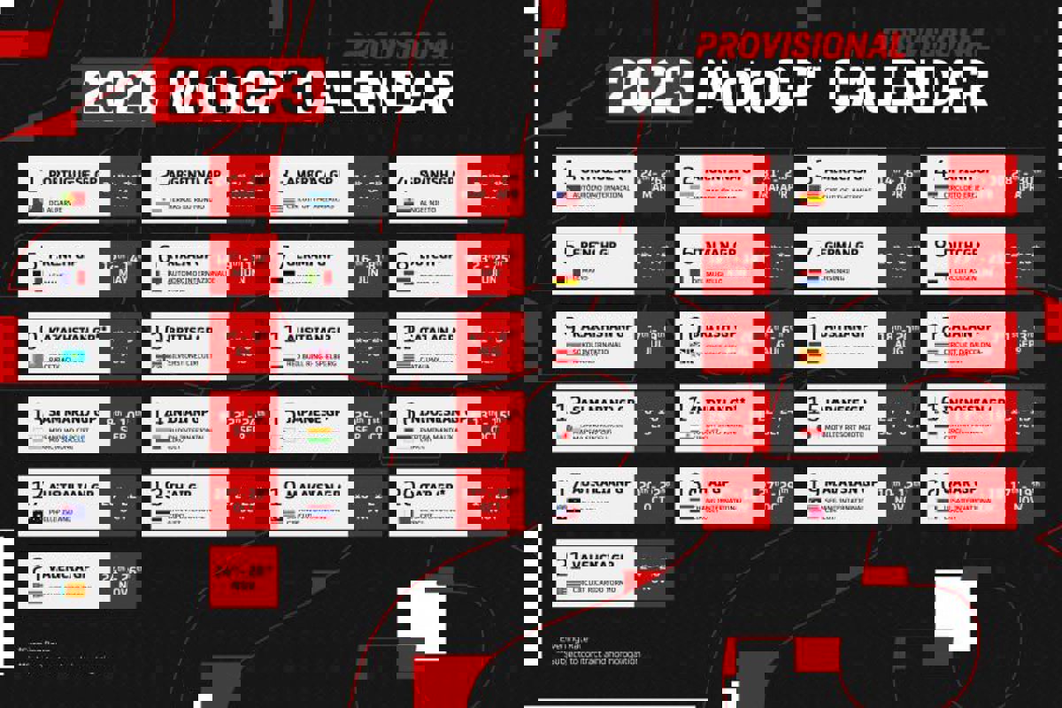 Como ya anunció la empresa organizadora del campeonato hace semanas, la temporada 2023, que se desarrollará en 21 carreras en 18 países, no arrancará en el Circuito Internacional de Lusail, sino en el Autódromo Internacional del Algarve en Portimao (Portugal), y finalizará, como sucede desde hace 20 años, en el Circuit Ricardo Tormo de Cheste (Valencia).