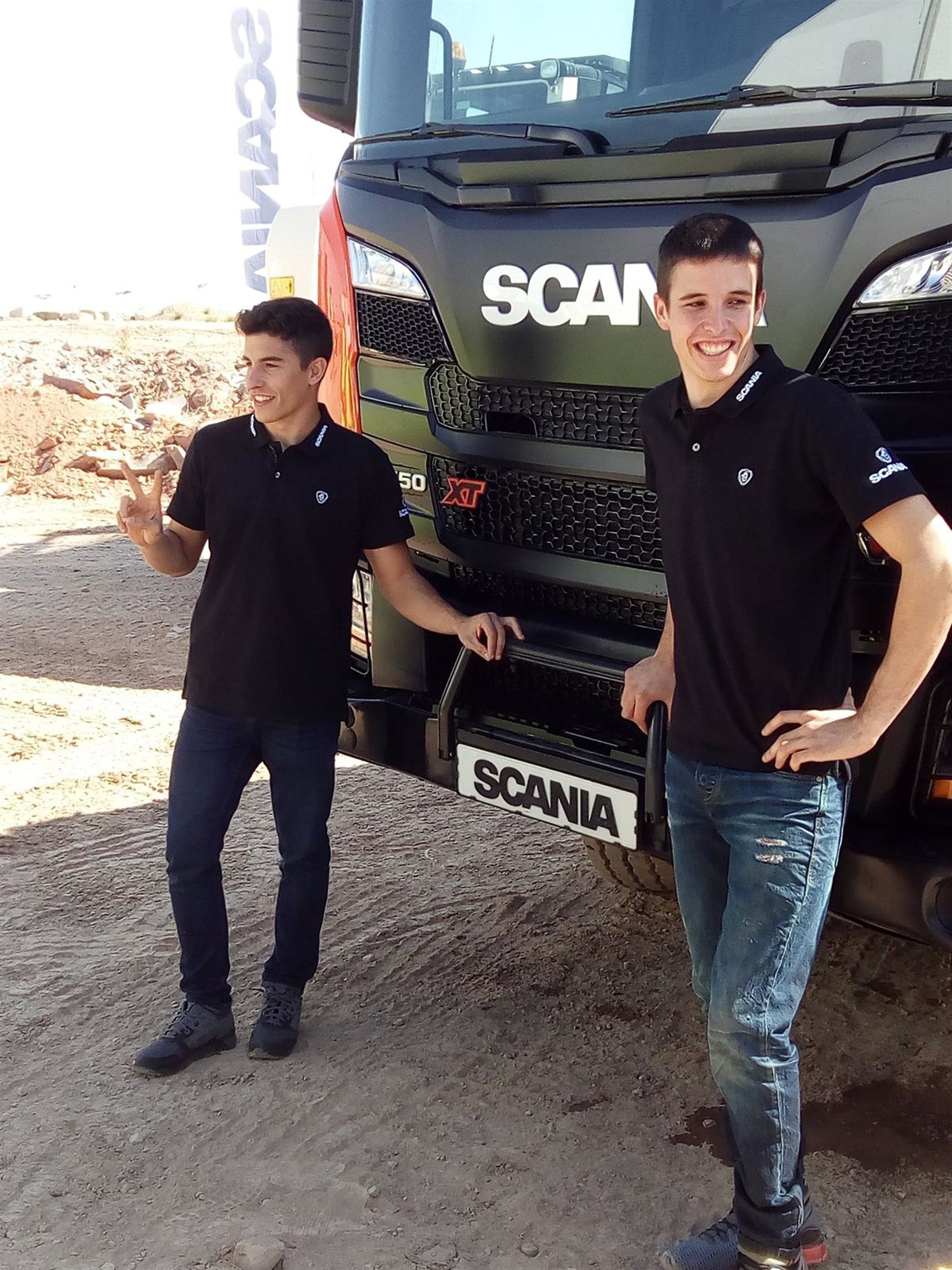 La Cantera Anía de Calatorao (Zaragoza) sirvió de escenario para que Marc y Àlex Márquez probaran algunos de los nuevos camiones de la gama XT de Scania, como el G410 8x4 con el que se enfrentaron a pruebas de habilidad al volante, tales como un arranque en pendiente, maniobras de precisión o pasar por terreno inundado.