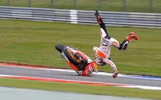Márquez sufrió una espectacular caída en la curva de Ramshoek, una de las más rápidas del circuito, que le hizo dar una vuelta en el aire, deslizándose por el asfalto con su montura encima. Sin embargo, pronto se levantó y pudo abandonar el circuito por su propio pie.