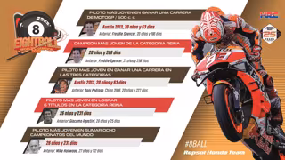 Fue, además, el piloto más joven en llegar a los 200 Grandes Premios en el Mundial (GP de Aragón) y el más joven de la historia en ganar seis mundiales de la categoría reina (26 años), superando a Rossi y Agostini (29). Es también el tercer piloto en la historia en lograr seis o más títulos de la categoría reina con Rossi y Agostini (superando a Doohan) y el más joven en ganar 8 mundiales en todas las categorías (Rossi: 29; Agostini: 28; Nieto: 30; Hailwood: 27; Ubbiali: 30). Tras Nieto, es el segundo español en la historia en lograr ocho títulos o más.