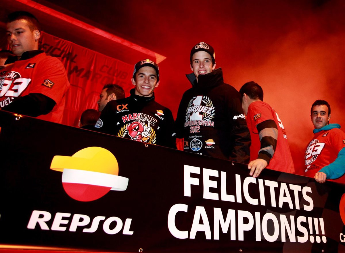 Márquez, campeón del Mundo de Moto2, ha recibido este viernes junto a su hermano Álex --campeón de España de Velocidad-- un caluroso homenaje por parte de sus vecinos y seguidores. Más de tres horas de saludos, aplausos y ovaciones para los protagonistas de una temporada para enmarcar.