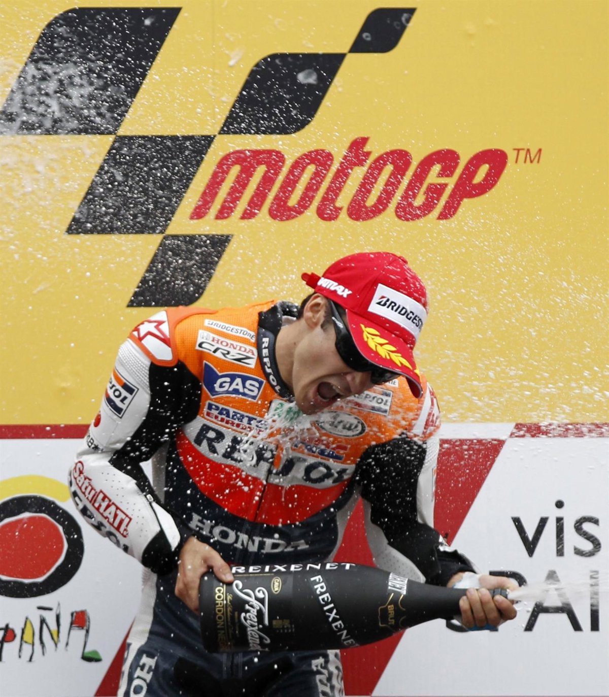 Pedrosa cosechó su tercera victoria del año en el escenario donde hace un año perdió sus opciones en el Mundial a causa de una caída. El catalán se encontró muy pronto en la primera posición de una carrera particularmente accidentada que empezó con la caída y abandono de Valentino Rossi (Ducati) ya en la primera curva.