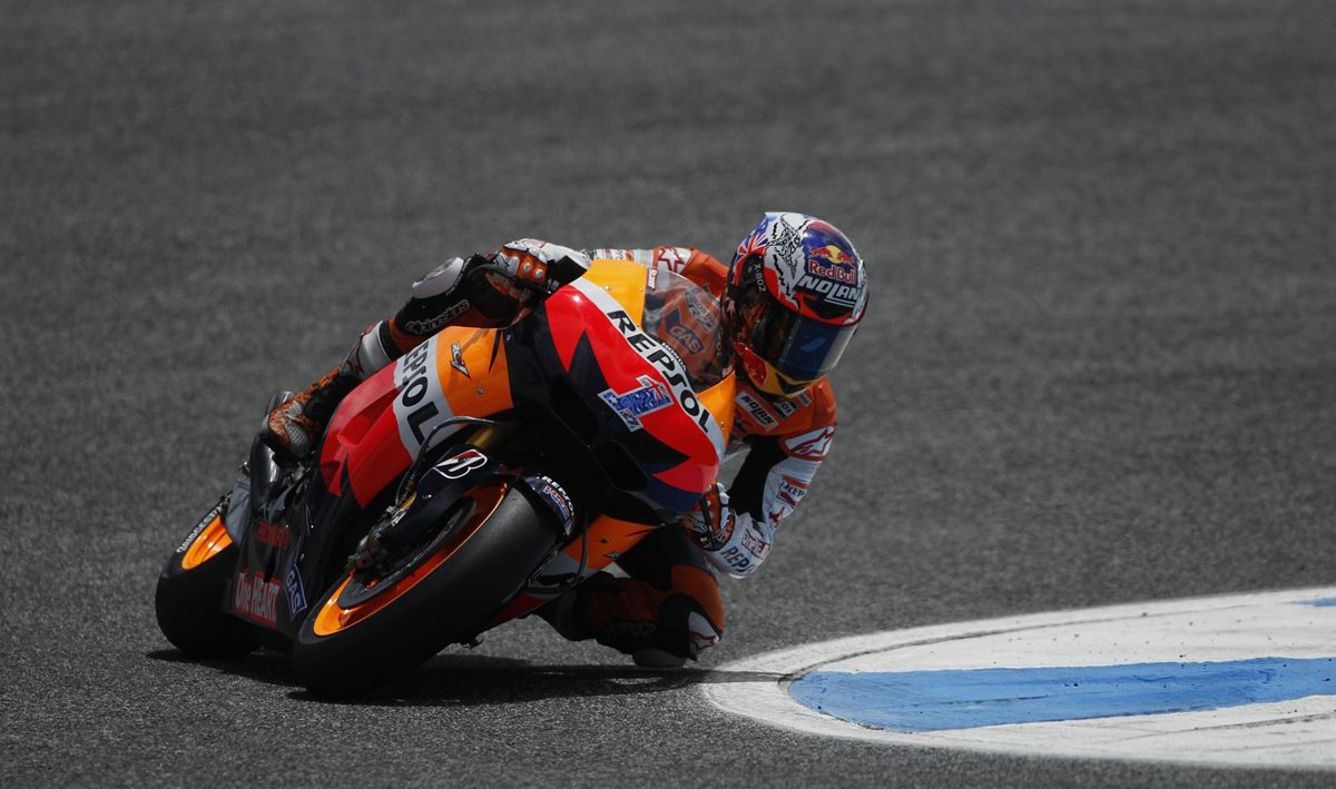 Tras una preciosa prueba de Moto2 en donde el dúo Márquez-Espargaró hicieron vibrar al público de Estoril, en la categoría reina también se vio a los dos españoles que suelen brindan espectáculo, Pedrosa y Lorenzo. Sin embargo, ya desde el sábado, Stoner dominó los entrenamientos para salir desde la 'pole' y, aunque el piloto catalán realizó una buena salida, un 'trallazo' en su moto permitía a Lorenzo pasarle en la primera vuelta.