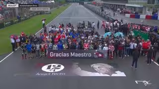 Tras una pancarta con el lema 'Gracias maestro', la parrilla al completo de las tres categorías del campeonato, acompañada por ingenieros, directores y demás trabajadores, ha querido recordar al que fue '12+1' veces campeón del mundo de motociclismo, como recordaba un tifo sobre el circuito acompañado por una imagen del malogrado piloto.