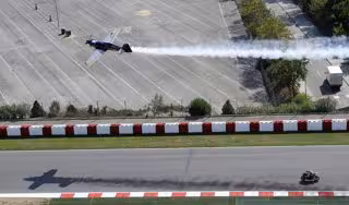 El piloto español de MotoGP Dani Pedrosa (Honda) y el participante en las Red Bull Air Race Alejandro MacLean tuvieron un bonito y espectacular duelo en el Circuit de Montmeló, en el que el avión del madrileño resultó ganador al superar los 400 kilómetros por hora.