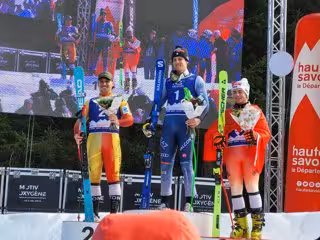 El esquiador español Ander Mintegui en el segundo escalón del podio del Supergigante de los Mundiales Júnior de 2024 - RFEDI