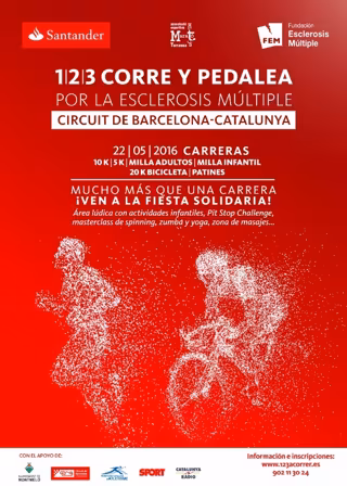 Banco Santander promoverá una carrera en el Circuit de Barcelona-Catalunya de Montmeló, que acogerá el próximo 22 de mayo la décima edición de la '1/2/3 Mulla't i Corre per l'Esclerosi Múltiple' ('1/2/3 Corre y Pedalea por la Esclerósis Múltiple'), una carrera solidaria a pie y en bicicleta que apoya la lucha contra la Esclerosis Múltiple.