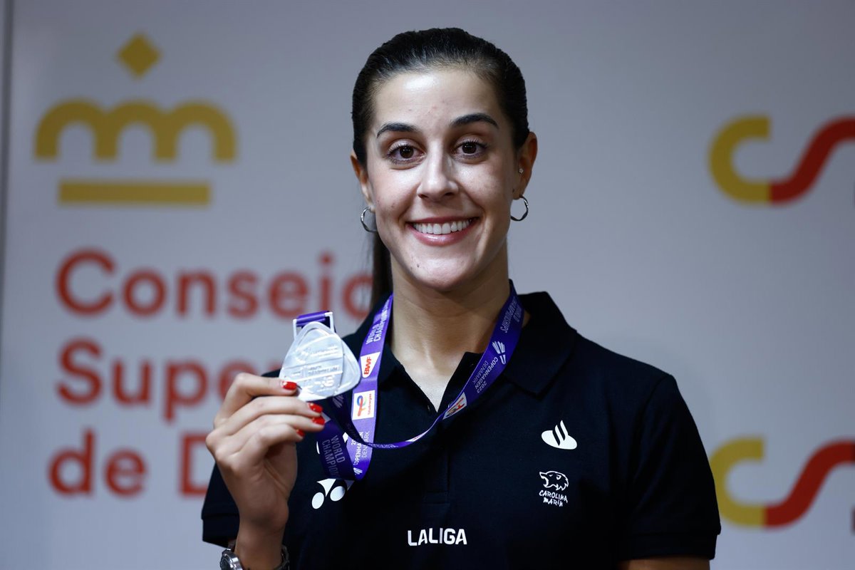 La jugadora española de bádmiton Carolina Marín muestra su medalla de plata en el Mundial de 2023 en Copenhague en la sede del CSD. - Oscar J. Barroso / Afp7 / Europa Press