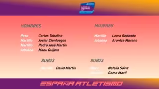 Un total de 9 atletas españoles viajarán a Leiria, seis que competirán en categoría absoluta y tres, en sub-23. En la absoluta, lideran la convocatoria los dos plusmarquistas de martillo, el extremeño Javier Cienfuegos (75.29) en su decimotercera participación (11 absolutas) que le convierten en el lanzador-récord masculino, y la catalana Laura Redondo, otra habitual en la selección española, en su undécima actuación (dos fueron en sub-23), que llega en un gran momento de forma con 69.60 metros.