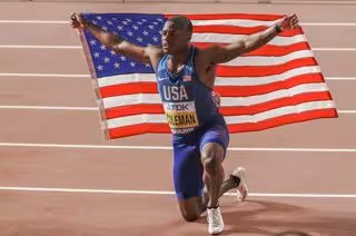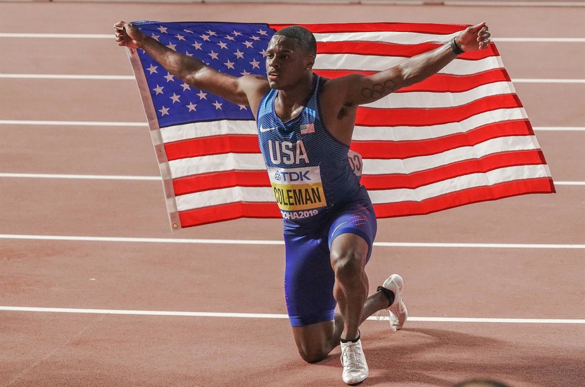 Christian Coleman posa con la bandera estadounidense tras ganar el oro en los 100 metros de los Mundiales de Doha 2019 - Michael Kappeler/dpa - Archivo