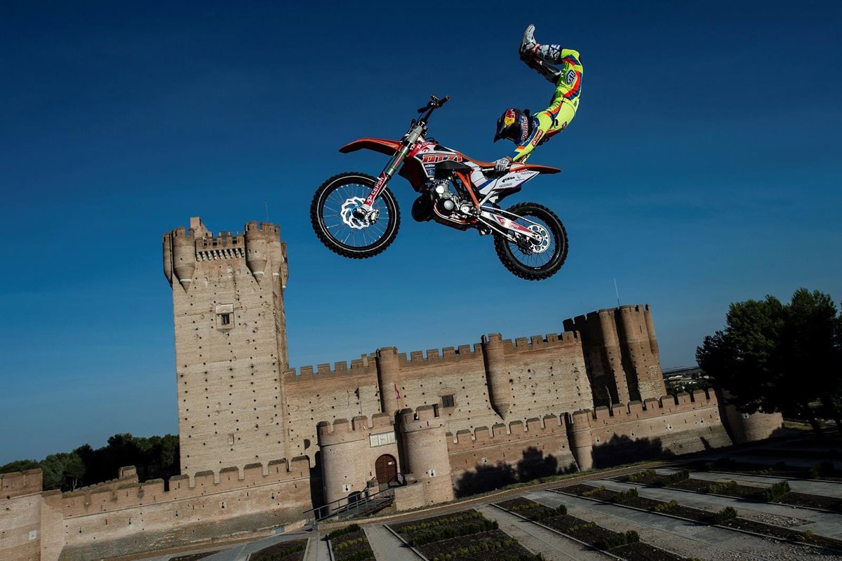 Los pilotos españoles Dany Torres y Maikel Melero han realizado una exhibición sobre el 'Castillo de la Mota' de Medina del Campo en Valladolid, a tan sólo dos días de la celebración de la tercera prueba del Campeonato Mundial Red Bull X-Fighters, que se celebrará en la Plaza de las Ventas de Madrid este viernes.
