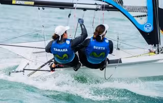 La pareja formada por la gallega Támara Echegoyen y la cántabra Berta Betanzos comenzó bien su participación en el Mundial de la clase 49er, situándose segundas, mientras que en Nacra 17, Iker Martínez y Julia Rita sufrieron un accidente y no pudieron terminar la segunda jornada.