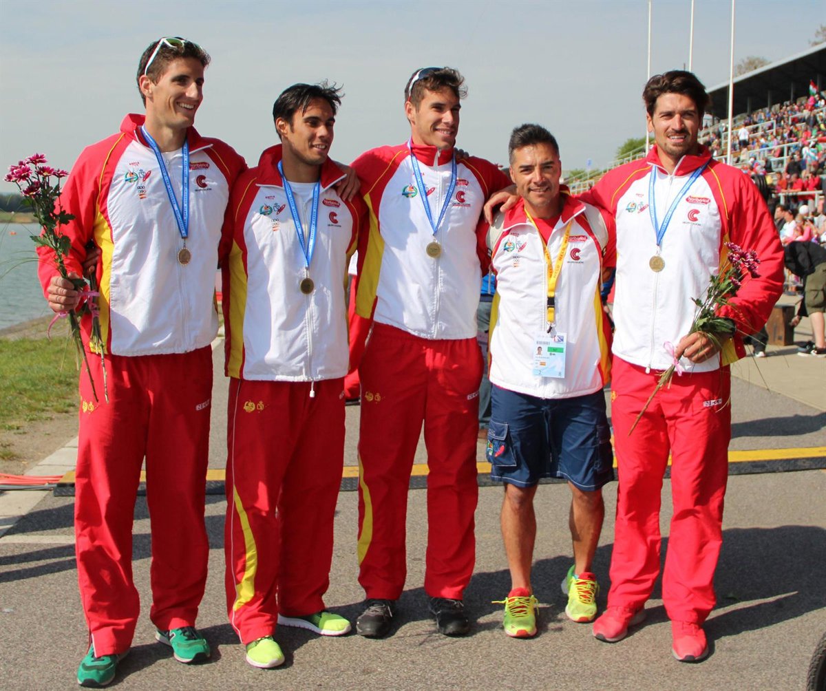 El K4 español, compuesto por el asturiano Javier Hernanz, los gallegos Rodrigo Germade y Oscar Carrera y el vasco Iñigo Peña, se ha colgado la medalla de bronce en la final de K4 1000 metros en la tercera jornada de los Campeonatos de Europa, misma medalla que logró Sete Benavides en las finales de 200, que han finalizado este domingo en la pista de Racice (República Checa) al lograr un crono de 2:58.572.