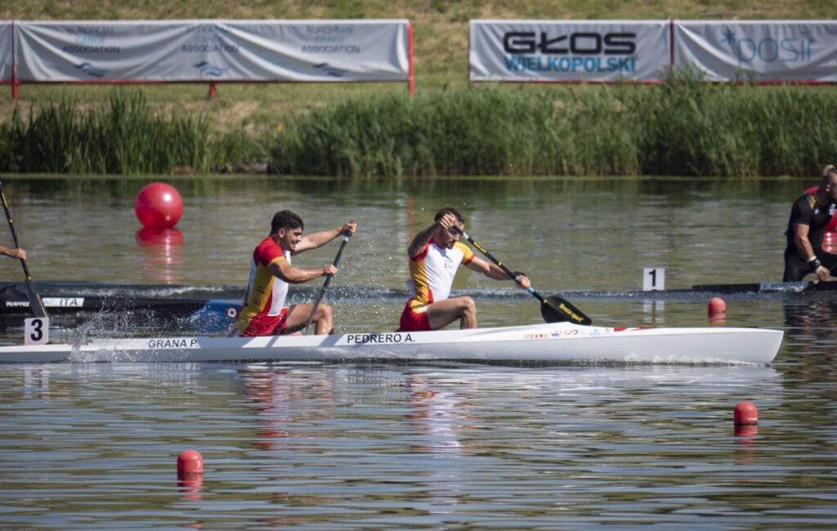 El campo de regatas del lago Malta, sin público por las restricciones contra el coronavirus, dejó dos oros en esprint para España, Alberto Pedrero y Pablo Graña en C2 200 y Joan Toni Moreno en C1 200, y una de plata, la de Begoña Lazkano y Laia Pelachs en K2 1.000 metros.
