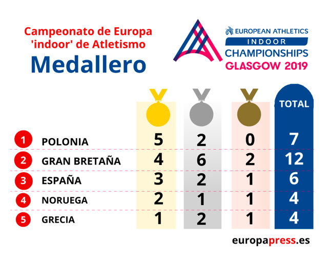 Después de la plata de Óscar Husillos en 400 metros el sábado, el domingo se guardó una traca que dejó a España tercera en el medallero, por detrás de Polonia y Gran Bretaña. El equipo español fue cuarto en la tabla de finalistas, con 16, y mejoró con creces su actuación hace dos años en Belgrado, donde logró cuatro medallas con solo un oro.