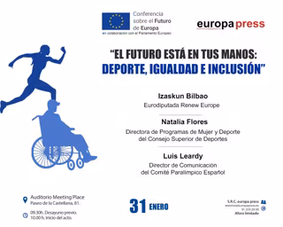 Bajo el título 'El Futuro está en tus manos: deporte, igualdad e inclusión', Izaskun Bilbao, Natalia Flores y Luis Leardy participarán en el Encuentro Informativo con motivo de la Conferencia sobre el Futuro de Europa (COFOE), organizado por la agencia Europa Press en colaboración con el Parlamento Europeo, que tendrá lugar (10:00 horas) en el Auditorio Meeting Place de la capital de España.