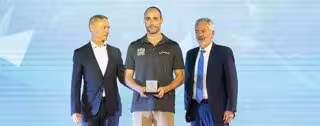 Archivo - Javier Sáez (izquierda), en la Gala RFEN 2022 premiando, junto a Fernando Carpena, al nadador máster Mikel Bildosola - RFEN - Archivo