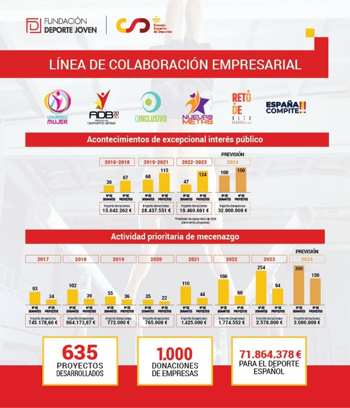 euros al deporte español mediante su línea de colaboración empresarial, y ha impulsado 635 iniciativas gracias a las cerca de 1.000 donaciones en las que han participado 969 empresas, informa el organismo dependiente del Consejo Superior de Deportes.
