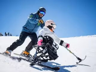 Una participante disfruta del esquí adaptado ayudada por un técnico de la Fundación También - FUNDACIÓN TAMBIÉN