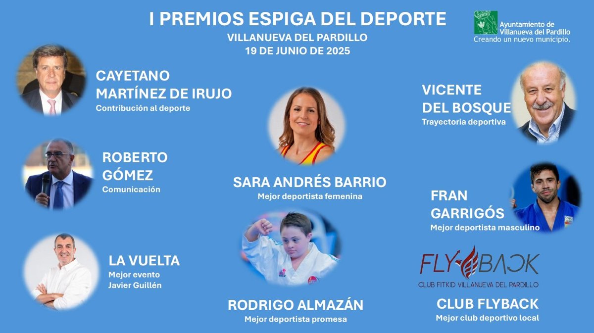 La atleta paralímpica Sara Andrés, el judoca Fran Garrigós, el ex seleccionador nacional de fútbol Vicente del Bosque, La Vuelta ciclista a España, el jinete y empresario Cayetano Martínez de Irujo, el periodista Roberto Gómez, el karateca de parakarate Rodrigo Almazán y el Club Flyback serán galardonados este jueves en la primera edición de los Premios Espiga del Deporte de Villanueva del Pardillo (Madrid).