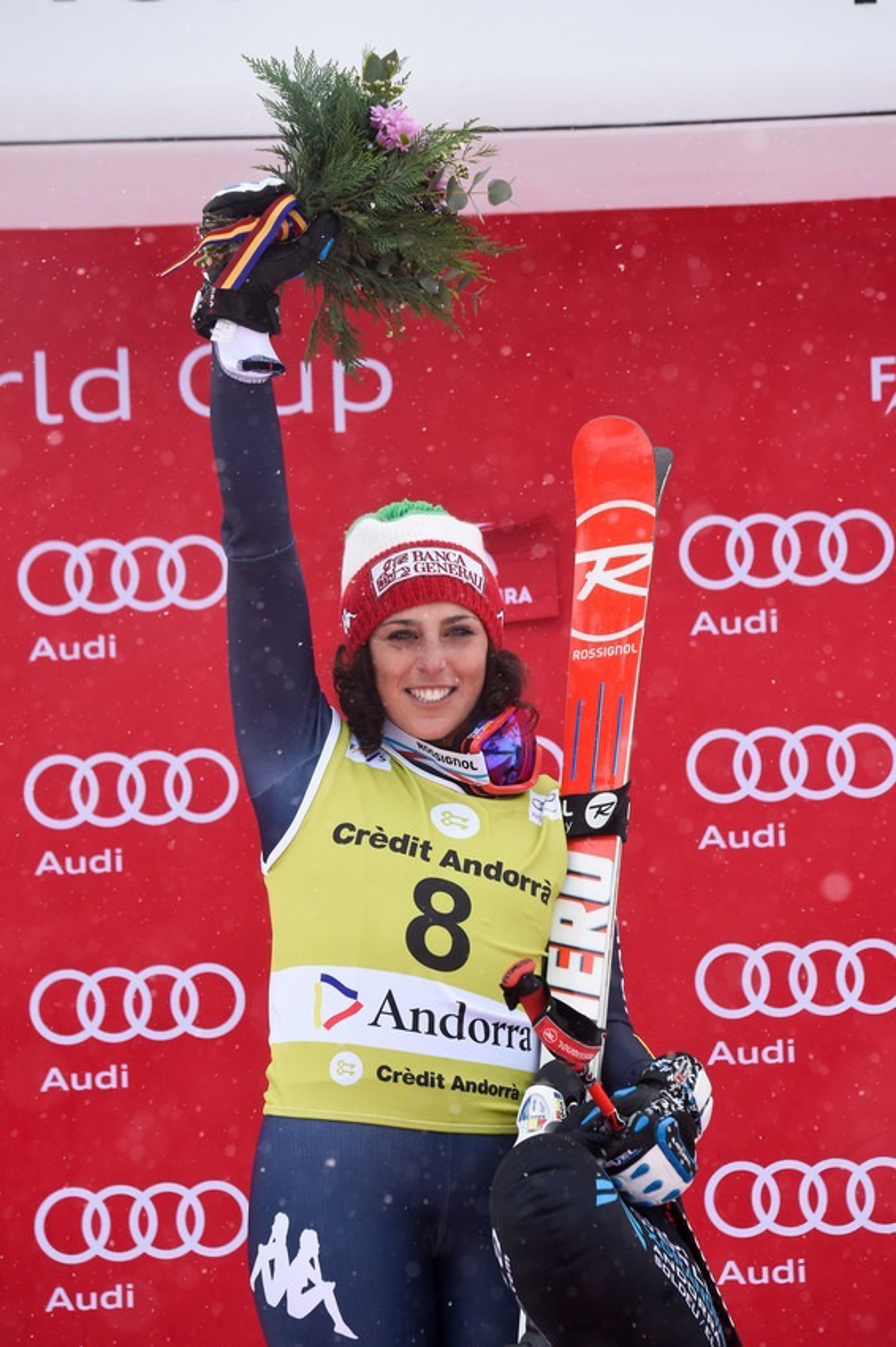 Brignone, especialista en gigante, se convirtió hoy en el nuevo punto de mira del Super-G femenino. La transalpina, que ha conseguido su primera victoria en esta disciplina de velocidad, suma 12 podios en Copa del Mundo con dos primeras posiciones (1ª en el Gigante en Soelden 2015 y hoy). La esquiadora ha realizado una gran carrera donde ha conseguido el mejor tiempo de 57s33.