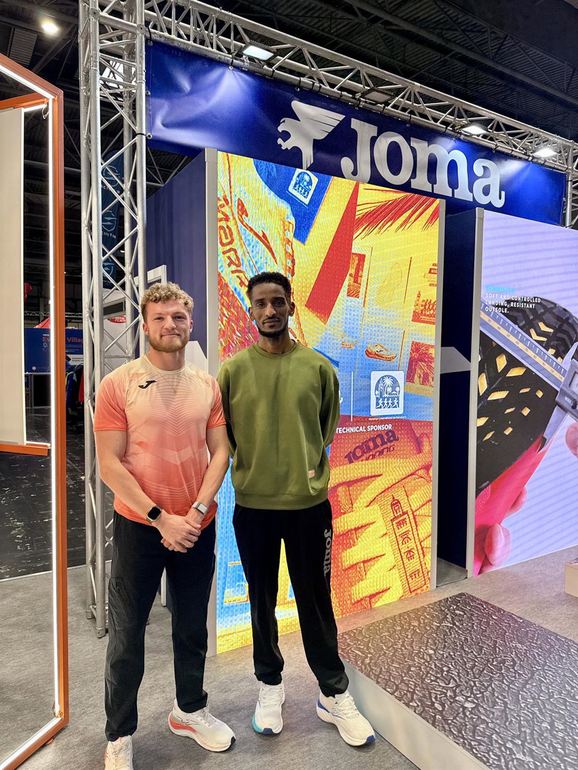 Los atletas de élite de Joma Josh Faulds y Weynay Ghebresilasie estuvieron en el stand de la marca deportiva española en la feria de running de Birmingham (Reino Unido). - JOMA