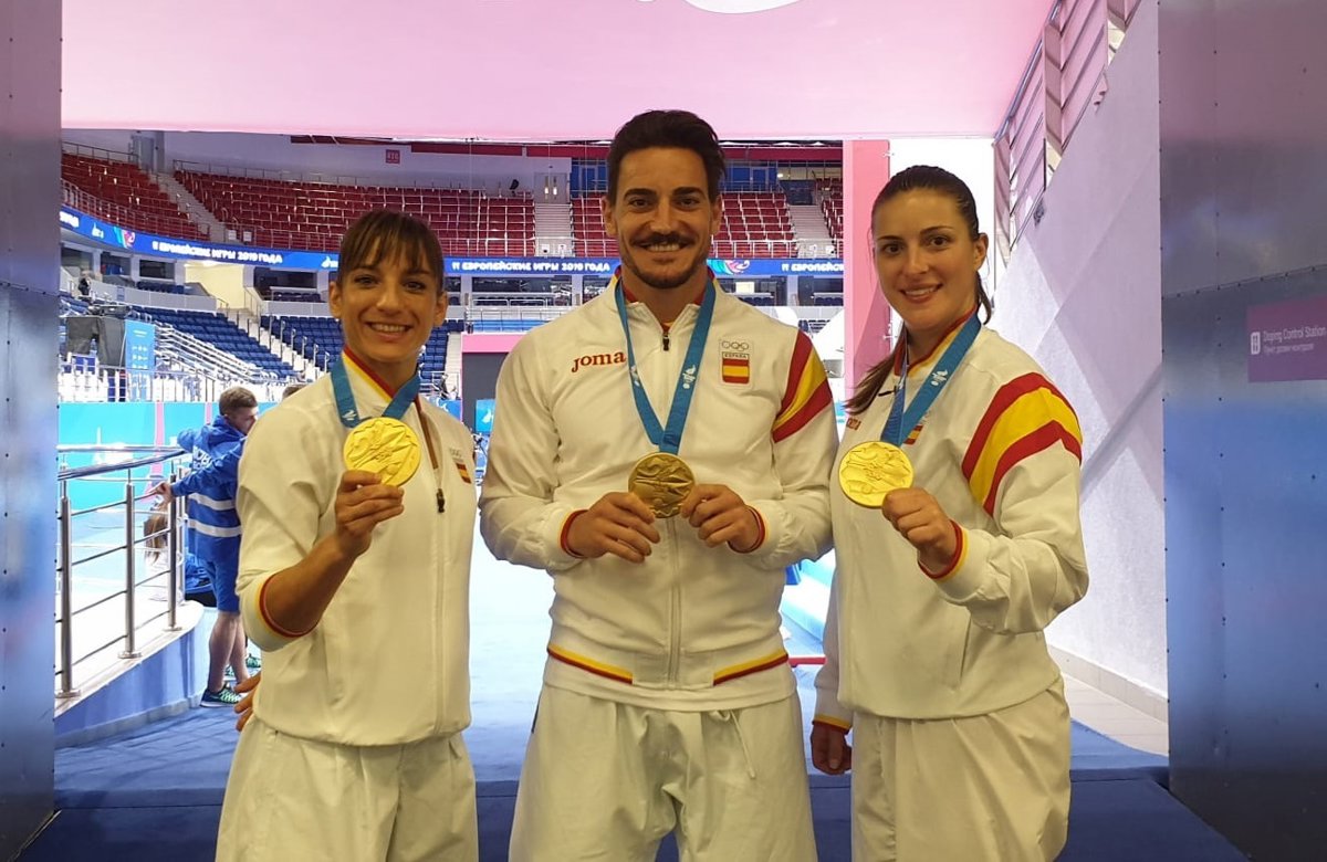 Los karatecas españoles Sandra Sánchez, Damián Quintero y Laura Palacio, en los Juegos Europeos de Minsk 2019. - RFEK